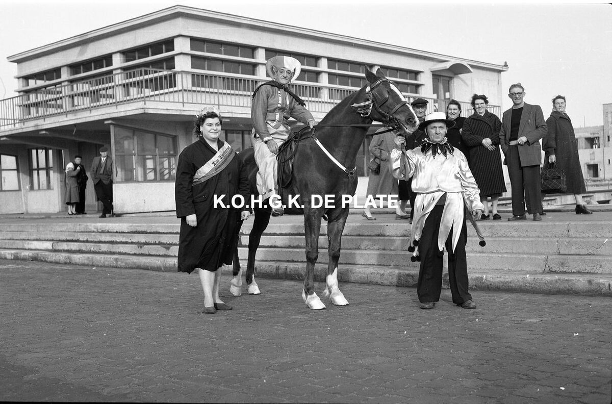 Formaat : 12,5 x 19 cm. - Lucienne Bollenberg, beter bekend als Lucy Monty, als miss Visserskwartier, met de prins carnaval, "Neuze" Bollenberg te paard, op de Visserskaai, nabij de Garnaalmijn