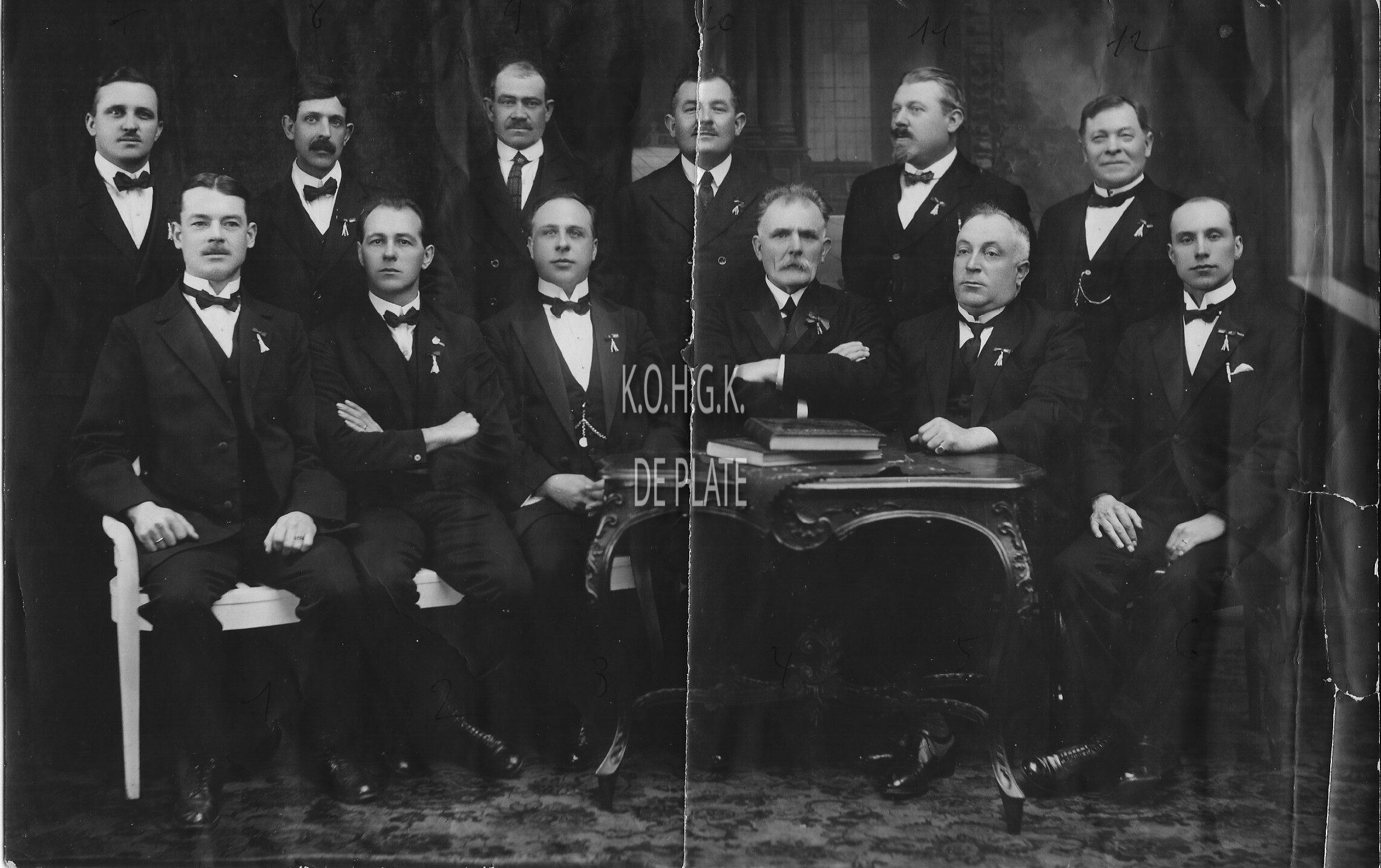 Formaat : 19 x 29 cm. - Foto genomen ter gelegenheid van de diamanten bruiloft van het echtpaar Verstraete- Quick. Zittend, derde van links, Jos. Lekens (°1883), van wijn- en likeurhandel "Au Vigneron", naast hem rechts, Al. De Graeve, van "Au Drapeau Belge", dan L. Hendrickx, flessenhandel, Fr. Verbiest, confiserie. Rechtstaand, derde van rechts, A. Vandewyngaerde, transport - Map 006 A-128