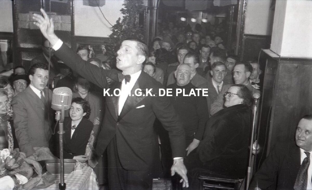 Negatief : 4 x 6,5 cm. - We zien Bertino tijdens zijn optreden in hotel "Stella Maris". Hij deed niet mee aan de westrijd. Maar trad wel op en zong waarschijnlijk zijn zeer populair lied "Ostende oender woater".