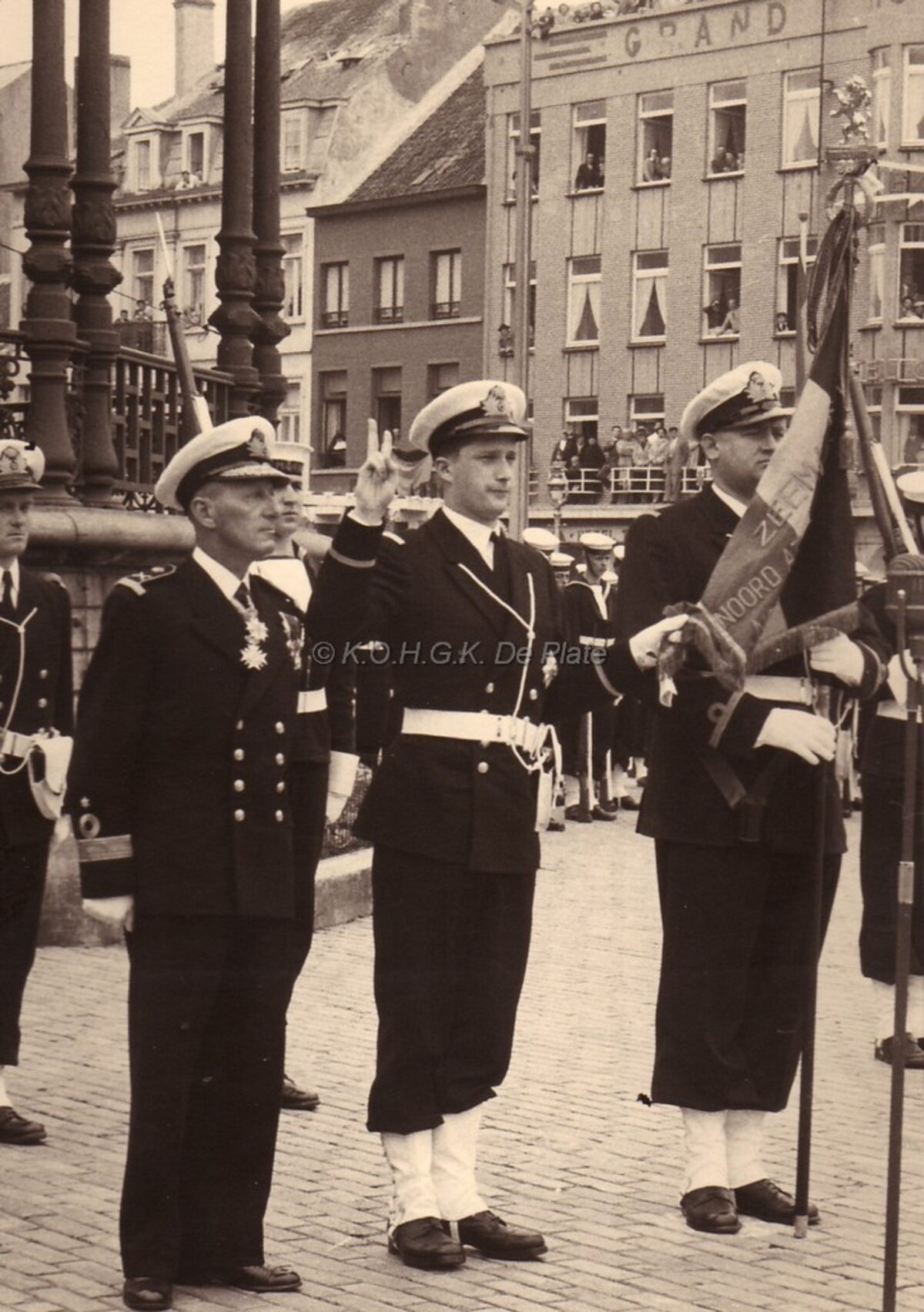 Formaat : 18 x 13 cm. - Het Wapenplein. Close up van de eedaflegging door prins Albert als vaandrig-ter-zee 2e klas op het vaandel der Zeemacht. Naast hem commodore Georges Timmermans. De standaarddrager is vaandrig-ter-zee 2e klas Willem Demuylder