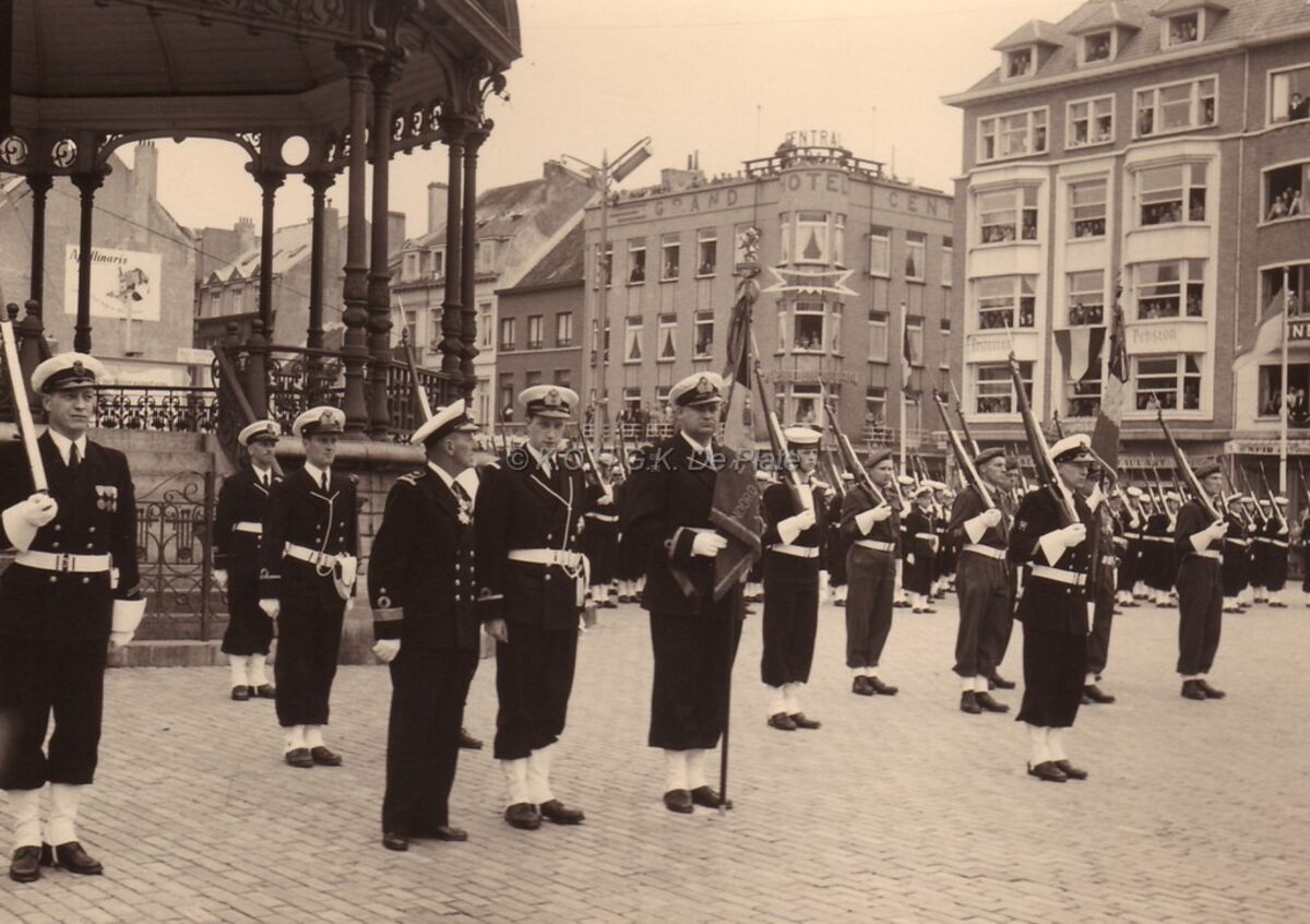 Formaat : 13 x 18 cm. - Het Wapenplein. Eedaflegging van prins Albert als vaandrig-ter-zee 2e klas. Hij krijgt raad van Georges Timmermans, commodore van de Zeemacht. Een detachement van de Luchtmacht (met vaandel) is aanwezig.