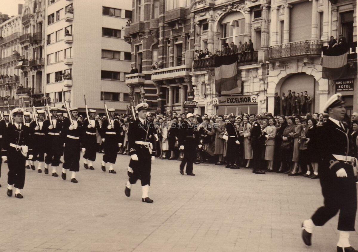 Formaat : 13 x 18 cm. - De Albert I-promenade. Het defile bij de beëdiging van Prins Albert en Edmond Poullet, de latere vice-admiraal, komt voorbij de hoek met de Christinastraat. De nationale vlaggen hangen aan het balkon