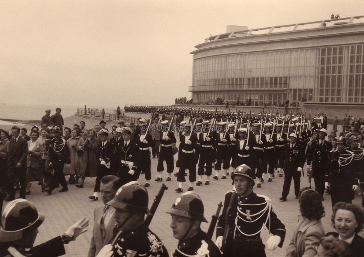 Formaat : 13 x 18 cm. - Het defile van de Zeemacht bij de beëdiging van Prins Albert op de Albert I-promenade aan het Kursaal nabij Peit Nice.. Naast de prins, Edmond Poullet, de latere vice-admiraal. 700 man van de Zeemacht defileren, een niet alledaags gebeuren. Zij worden voorafgegaan door de rijkswacht.
