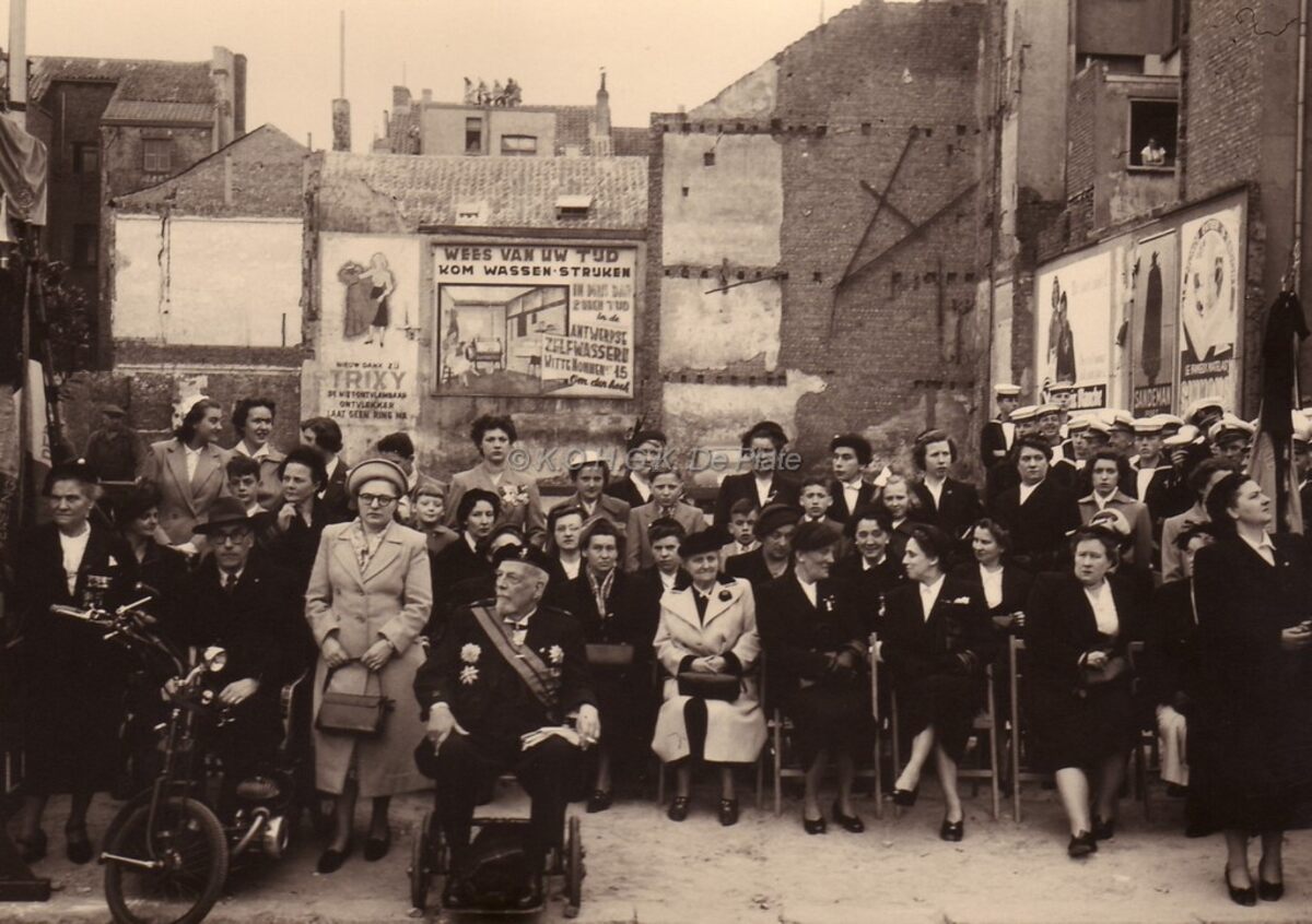 Formaat : 13 x 18 cm. - Oorlogsinvalieden, -weduwen en -wezen, oudstrijders, vaderlandslievende groeperingen en militairen van de Zeemacht (rechts), wachten op het Wapenplein de komst af van Prins Albert voor zijn eedaflegging als vaandrig-ter-zee 2e klas bij de Zeemacht.