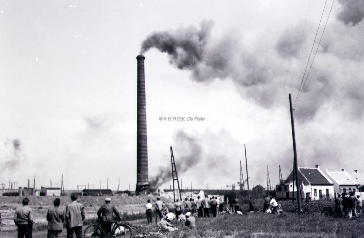 De mensen komen kijken hoe de schouw van de verbrandingsoven neergehaald wordt door middel van vuur. Rechts, de woningen in de Wateringstraat, gekend als de "Garre". Op de achtergrond de Konterdamkaai en spoorweg.