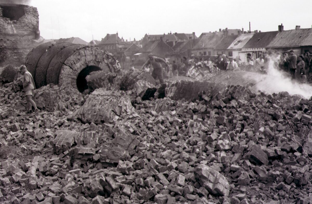 De schouw van de verbrandingsoven is net neergehaald. Op de achtergrond de huizen van de Wateringstraat.