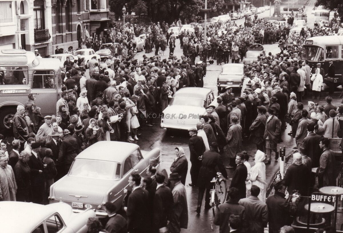 Gemotoriseerde vlaams nationale manifestatie, na afloop van de Ijzerbedevaart, gericht tegen het taalgebruik aan de kust. De kolonne wordt afgeleid in de Koninginnelaan, nabij het kruispunt Petit Paris. Links achteraan het Prinses Stefanieplein.