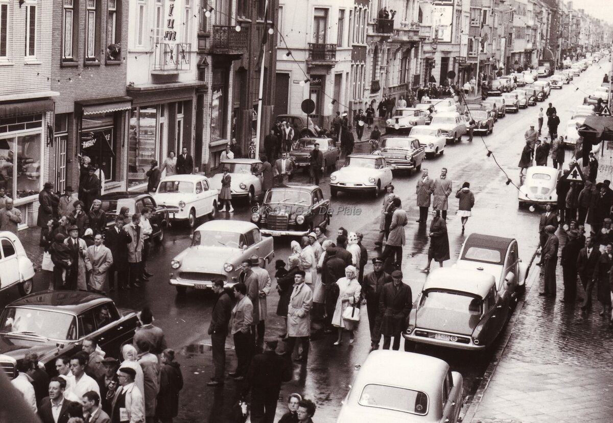 De Nieuwpoortsesteenweg, richting Mariakerke, nabij Petit Paris tijdens een gemotoriseerde vlaams nationale manifestatie. Links de hoek van de Toekomststraat.