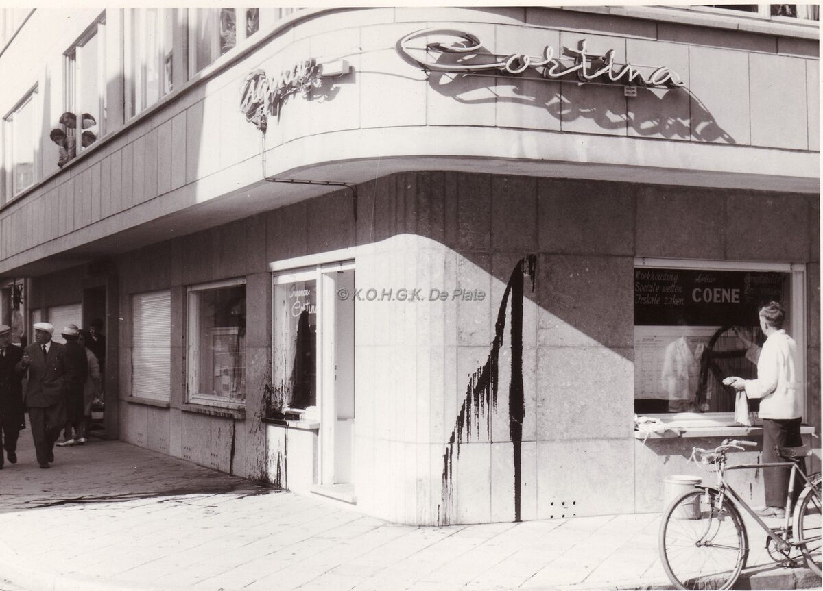 Agence Cortina op de hoek Karel Jannsenslaan (links) en de Leo Spiliiaertstraat. De gevel werd beklad door de deelnemers aan de vlaams nationale manifestatie van 18/08/1963.