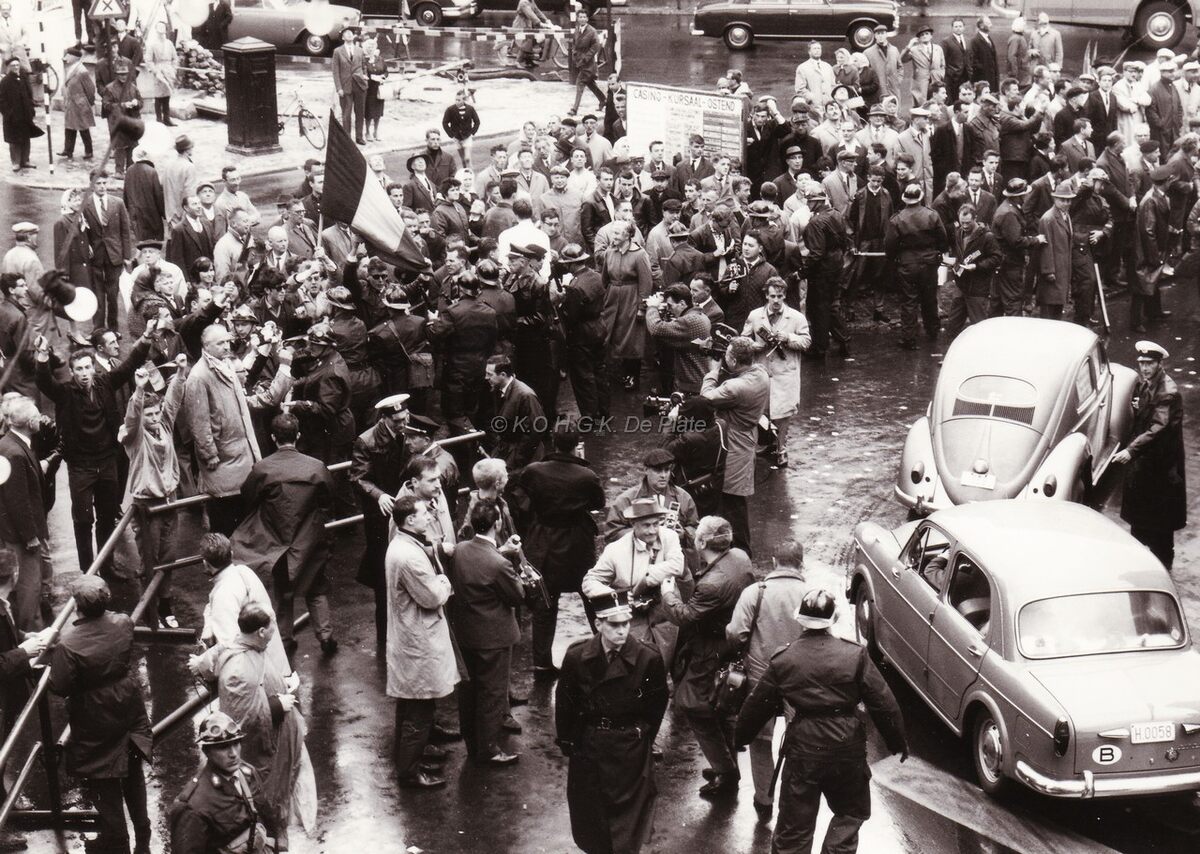 Omgeving Petit Paris tijdens de vlaams nationale manifestatie van 18/08/1963. Voor- en tegenstanders, en de rijkswacht tracht hen uit elkaar te houden.