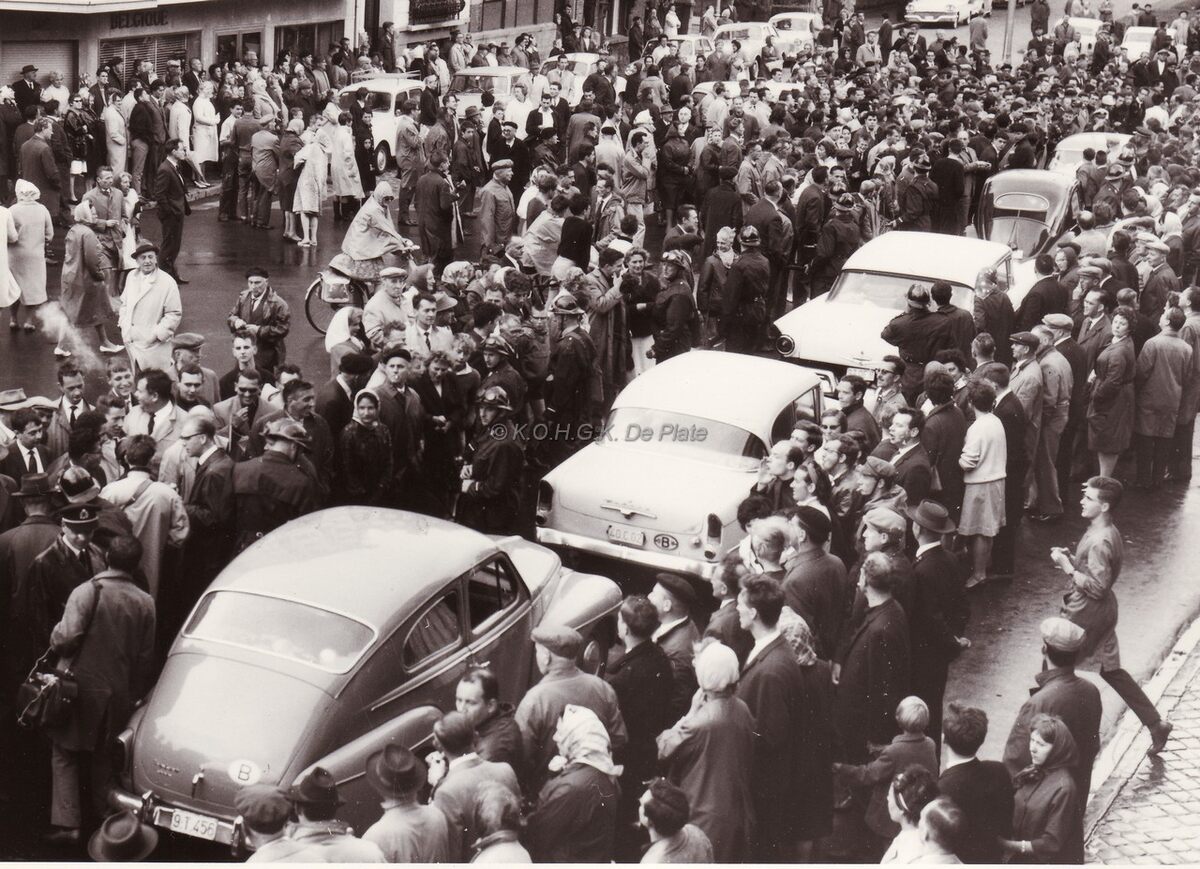 De deelnemers aan de vlaams nationale manifestatie van 18/08/1963 passeren op de Koninginnelaan nabij Petit Paris, tussen dichte rijen kijkers. De rijkswacht, in gevechtskledij, is in grote getale aanwezig.