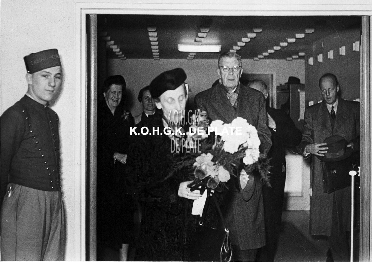 2 exemplaren, formaten : 28 x 24 cm. en 13 x 18 cm. - Het Zweeds vorstenpaar bij het verlaten van het Kursaal waar zij dineerden. Zij waren op doorreis van Engeland naar Zweden. Een piccolo is van dienst.