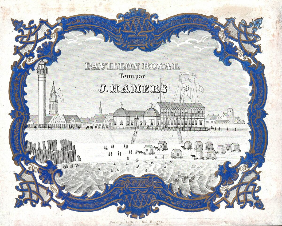 Formaat : 13,7 x 17,2 cm. - Pavillon Royal tenu par J.Hamers. Badkarren op het Klein Strand. helemaal links de vuurtoren en de kerktoren;