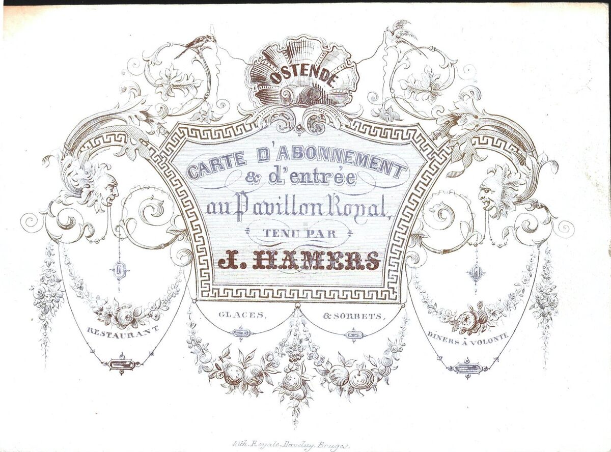 Formaat : 10,3 x 14,1 cm. - Carte d'abonnement & d'entrée au Pavillon Royal tenu par J.Hamers Ostende. Restaurant. Glaces & sorbets. Diners à volonté.