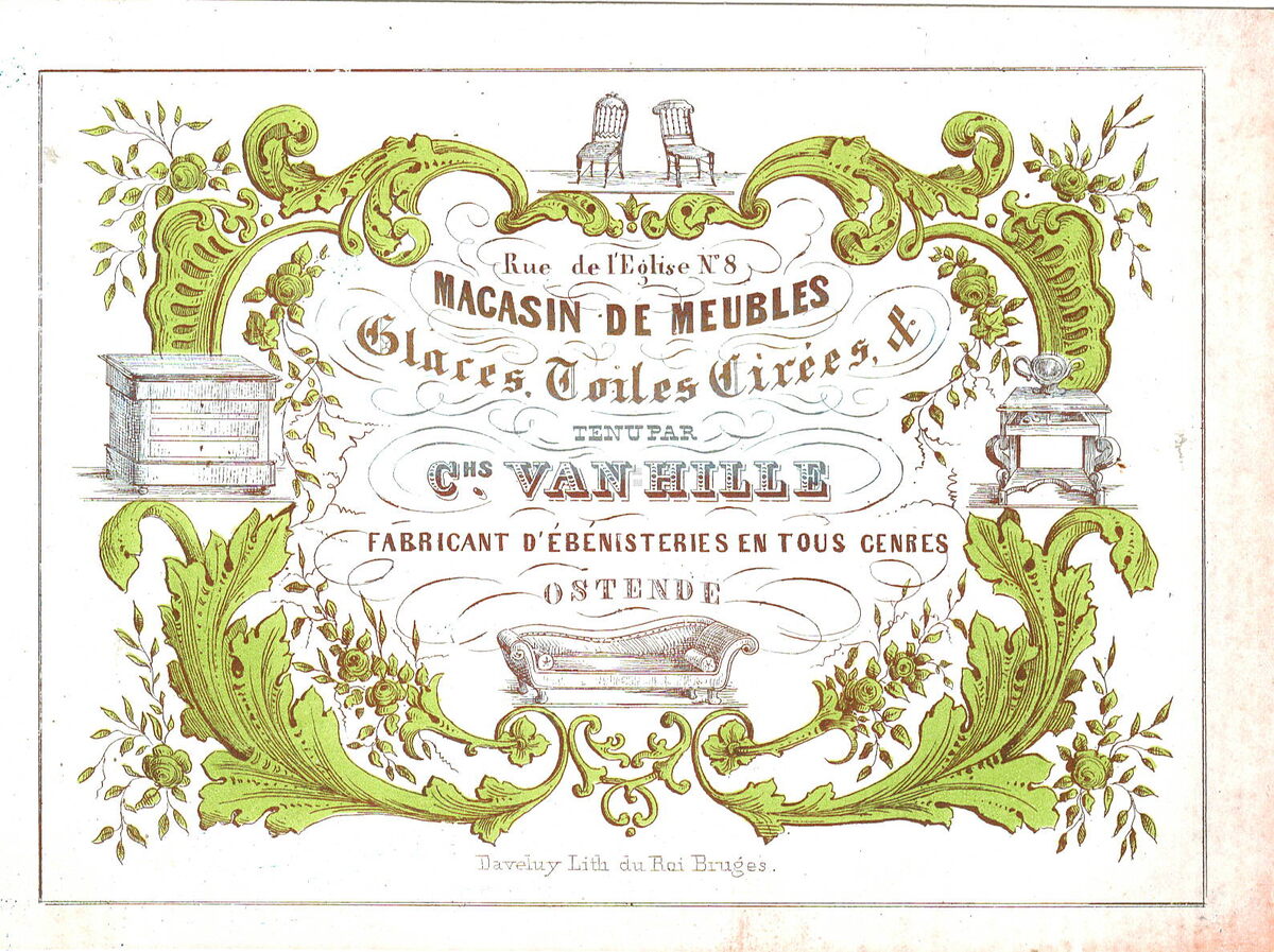 Formaat : 10 x 13,6 mm. - Magasin de Meubles, glaces,toiles cirées et Fabricant d'ébénisteries en tous genres tenu par Chs. Van Hille, Rue de l'Eglise n° 8 à Ostende. Groen ingekleurd.