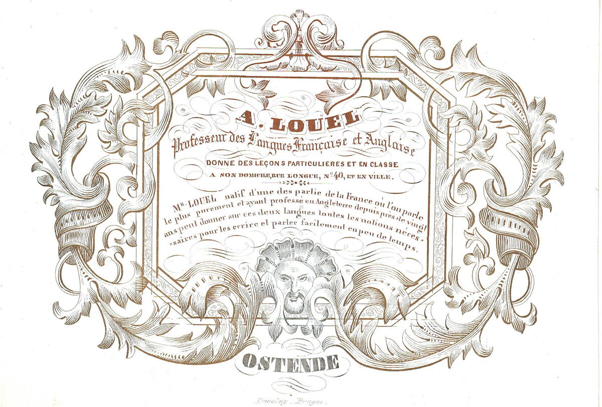 Formaat : 9,7 x 14,1 cm. - A.Louel Professeur des Langues Française et Anglaise. Donne des leçons particulières et en classe à son domicile, Rue Longue n° 40 et en Ville. Mr LOUEL natif d'une des partie de la France ou l'on parle le plus purement et ayant professé en Angleterre depuis prés de vingt ans peu donner sur ces deux langues toutes les notions nécessaires pour les écrire et parler facilement en peu de temps.