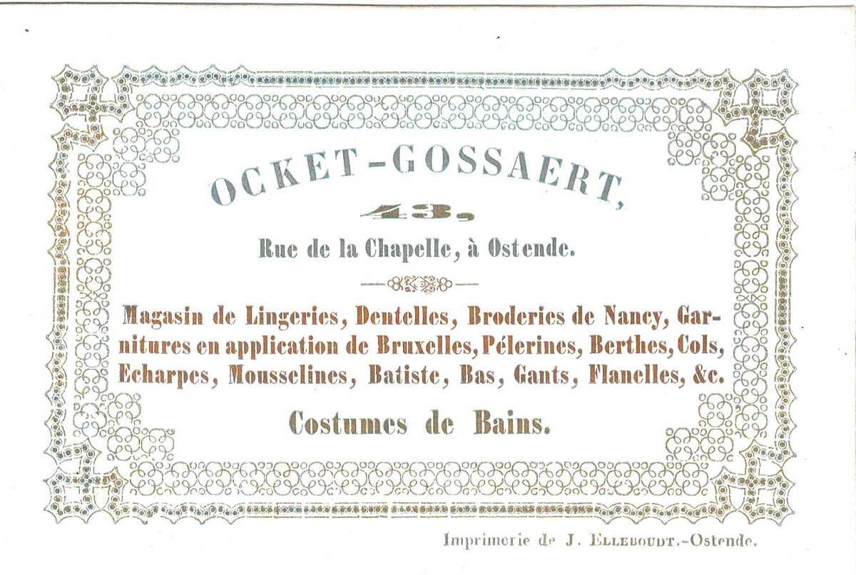 Formaat : 7,7 x 11,4 cm. - OCKET-GOSSAERT, Rue de la Chapelle à Ostende, Magasin de Lingeries, Dentelles, Broderies de Nancy, Garnitures en application de Bruxelles, Berthes, Cols, Echarpes, Mousselines, Batiste, Bas, Gants, Flanelles & Costumes de Bains.