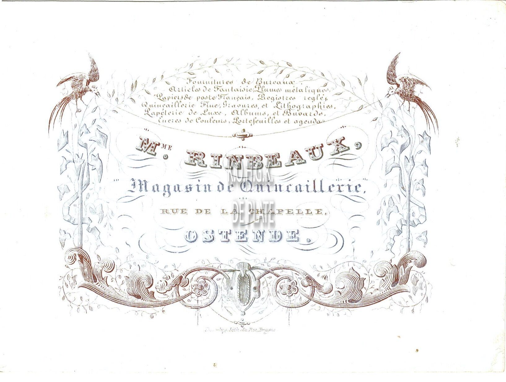 Formaat : 10,1 x 14 cm. - Mme. RINBEAUX Magasin de Quincaillerie, rue de la Chapelle Ostende. Fournitures de Bureaux, Articles de Fantasie, Plumes métaliques, Papiers de poste Français, Registres reglés, Quincaillerie fine, Gravures et Lithographies, Papéterie de Luxe, Albums,et Buvards, Encres de Couleurs, Portefeuilles et Agendas.