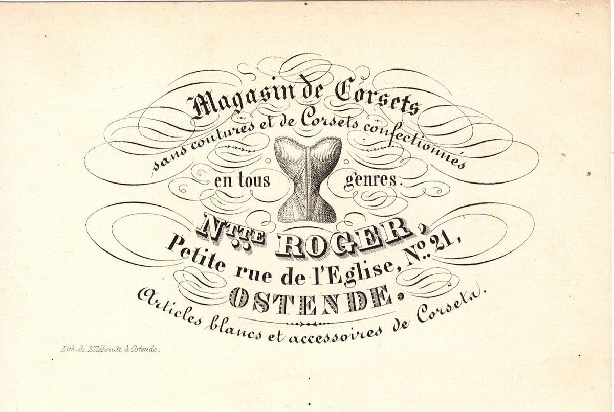 Formaat : 8,1x 12 cm. - Magasin de Corsets sans coutures et de Corsets confectionnés en tous genre Ntte. Roger. Petite Rue de L'Eglise N° 21 Ostende . Articles blancs ett accessoires de Corsets.