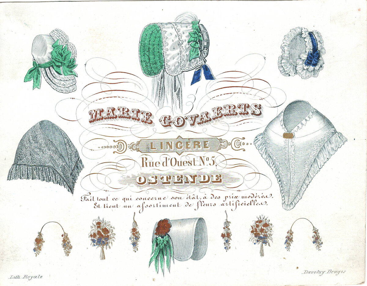 Formaat : 11 x 14,3 cm. - Marie Govaerts, Lingère Rue d'Ouest N° 5 Ostende. Fait tout ce qui concerne son étât à des prix modérés et tient un assortiment de fleurs artificielles.