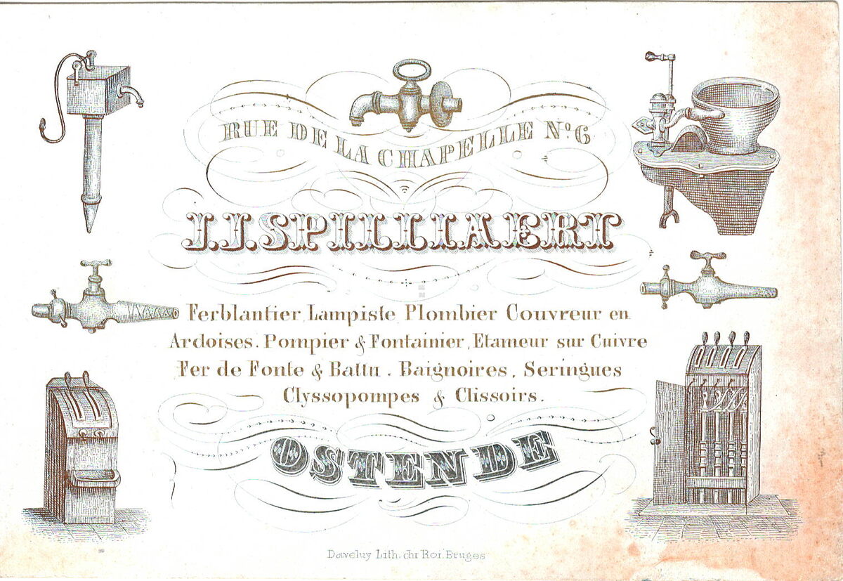 Formaat : 8,8 x 12,8 cm. - J.J.Spilliaert, Rue de la Chapelle N° 6.Ostende. Ferblantier, Lampiste, Plombier, Couvreur en Ardoises, Pompier & Fontainier Etameur sur Cuivre, Fer de Fonte & Battu, Baignoires, Seringues Clyssopompes & Clissoirs.