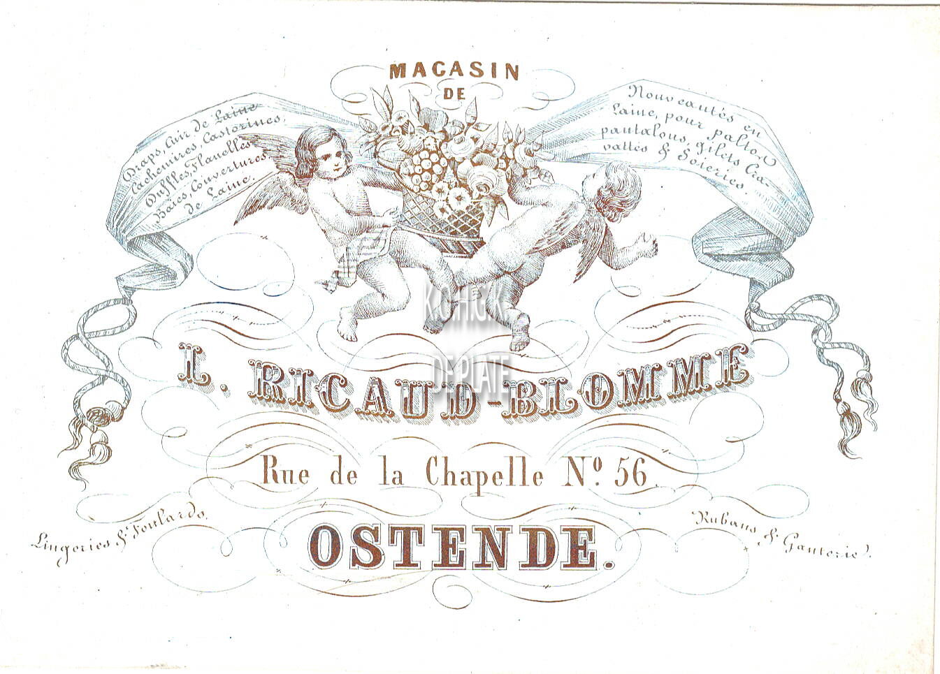 Formaat : 8,2 x 11,5 mm. - Magasin de Draps, Cuir, de Laine, Cachemirs, Castorines, Duffles, Flanelles, Couvertures de Laine. Nouveautés en laine pour paltau pantalons, gilets, cravattes & soieries. Lingeries & Foulards. Rubans & Ganterie, L.Ricaud-Blomme, Rue de la Chapelle N° 56 Ostende.,