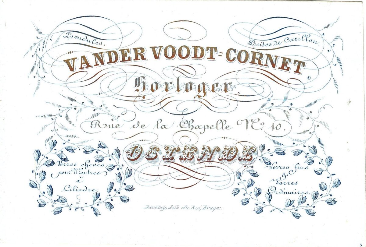 Formaat : 8,8 x 13 cm. - Vander Voodt-Cornet. Horloger. Rue de la Chapelle N° 10, Ostende. Pendules, Boites de Carillon. Verres chevés pour Montres à cilindre. Verres Fins & Verres Ordinaires.