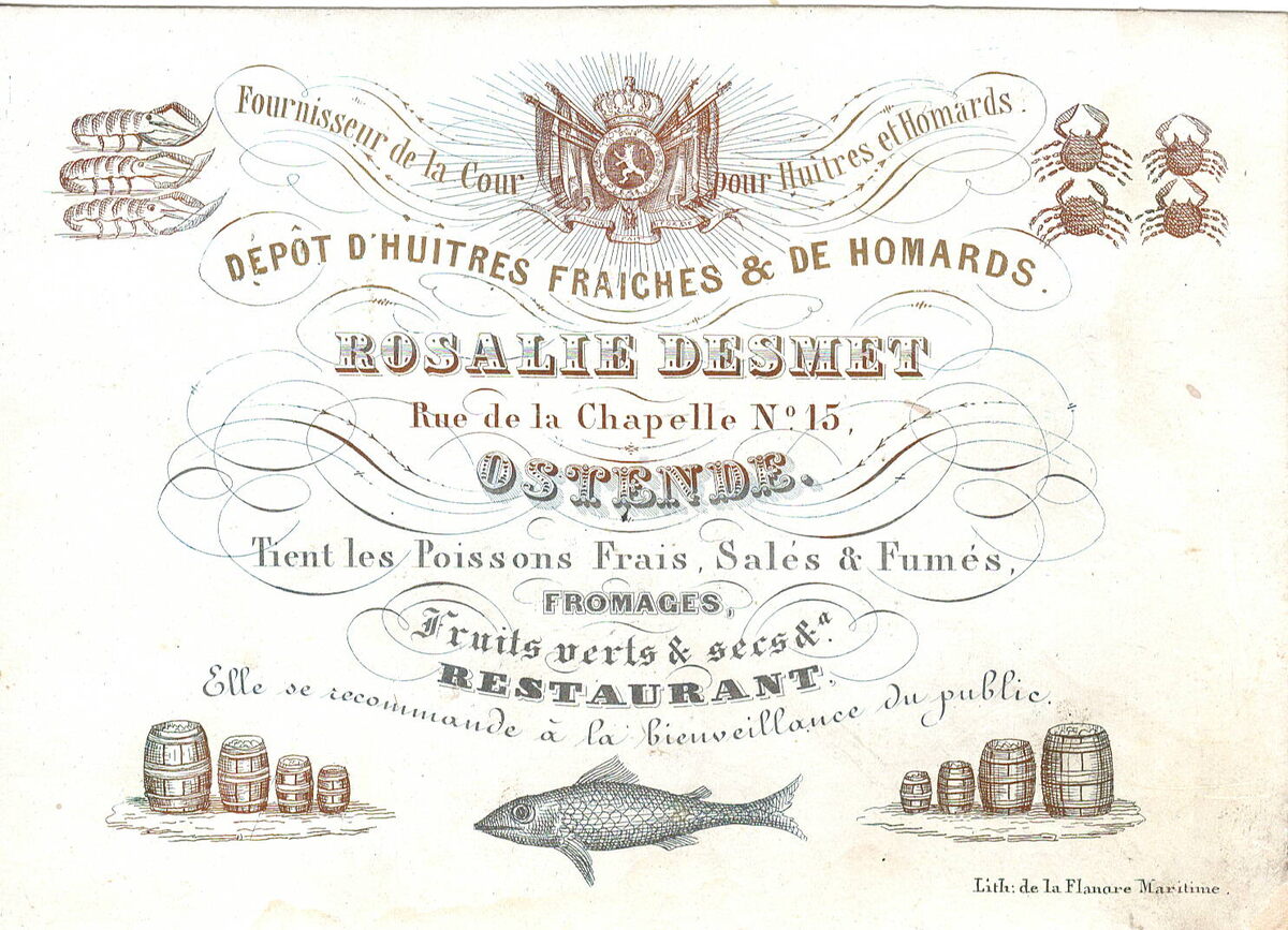 Formaat : 9 x 12,7 mm. - Dépôt d'Huitres fraiches & de Homards. Rosalie Desmet, Rue de la Chapelle N° 15 Ostende. Tient les Poissons Frais Salés & Fumés, Fromages, Fruits verts et secs & Restaurant Elle se recommande à la bienveillance du public. Fournisseur de la Cour pour Huitres et Homards.