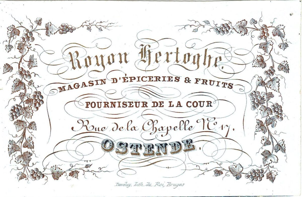 Formaat : 6,9 x 10,8 cm. - Royon Hertoghe, Magasin d'Epiceries & Fruits, Fourniseur de la Cour, Rue de la Chapelle N°17 Ostende.