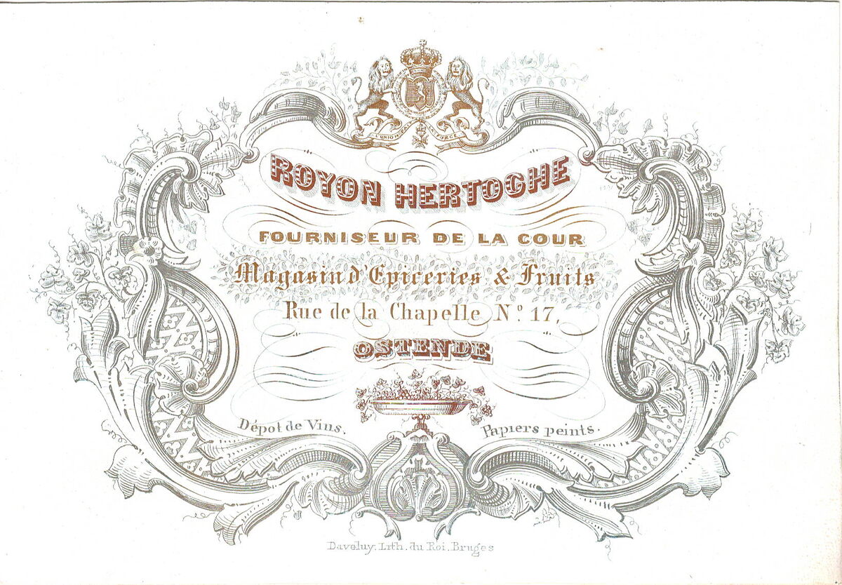 Formaat : 9,1 x 14 cm. - Royon Hertoghe, Fourniseur de la Cour. Magasin d'Epiceries & Fruits, Rue de la Chapelle N° 17 Ostende. Dépot de Vins. Papiers peints.