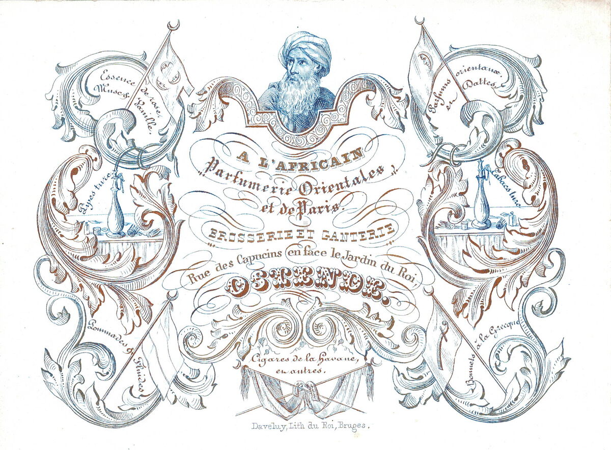 Formaat : 12 x 16 cm. - A L'Africain. Parfumerie Orientales et de Paris. Brosserie et Ganterie. Rue des Capucins en face le jardin du Roi Ostende. Cigares de la Havane et autres. Essense de rose, Muscs de Vanille. Pipes turc. Pommades & Fluides. Parfums orientaux et Dates. Tabacs turc. Bonnets à la Grecque.