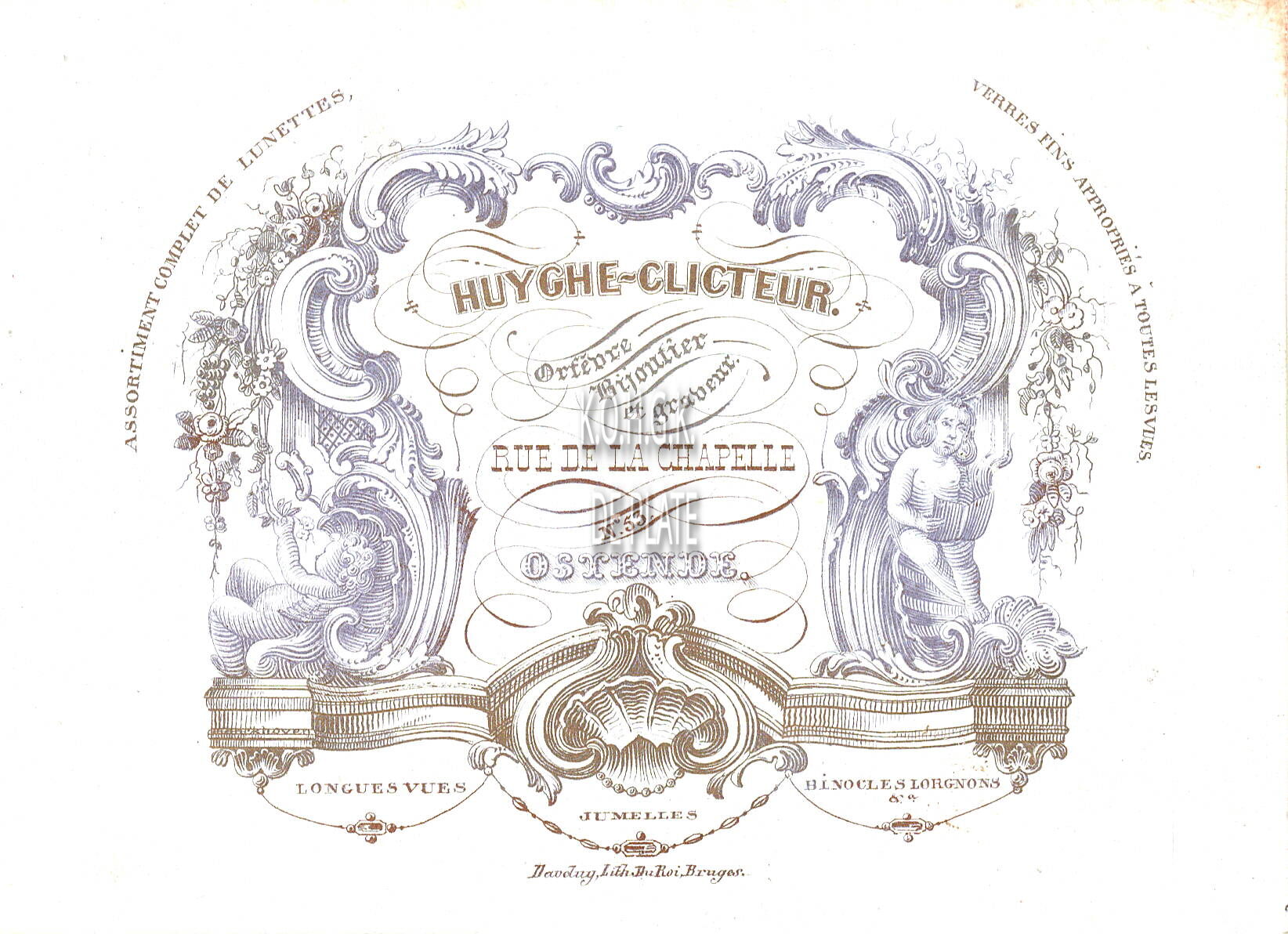 Formaat : 10,2 x 14,1 cm. - Huyghe Clicteur, Orfèvre Bijoutier et Graveur. Rue de la Chapelle N° 53 Ostende Assortiment complet de lunettes. Verres fins apppropriés à toutes les vues. Lonques vues, Jumelles Binocles Lorgnons &°. Paars en bruin ingekleurd