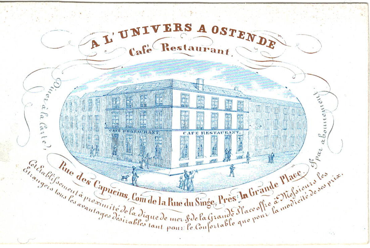Formaat : 6,8 x 9,5 mm. - A l'Univers à Ostende, Café restaurant. Rue des Capucins, Coin de la Rue du Singe Prés la Grand Place. Diner à la Carte & par abonnement. Cet Etablisement à proximité de la Dique de mer & de la Grande Place offre à Messieurs les Etrangers tous les avantages désirables tant pour le Confortable que pour le modicité de ses prix.