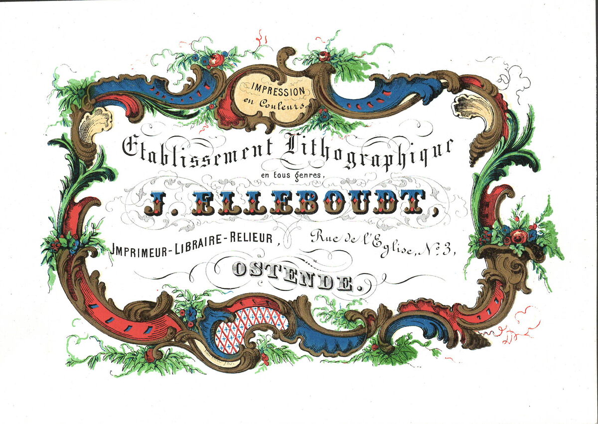Formaat : 11,5 x 16,1 cm. - Etablissement Lithographique J.Elleboudt, Imprimeur-Libraire-Relieur Rue de l'Eglise N° 3 Ostende Impression en couleur.