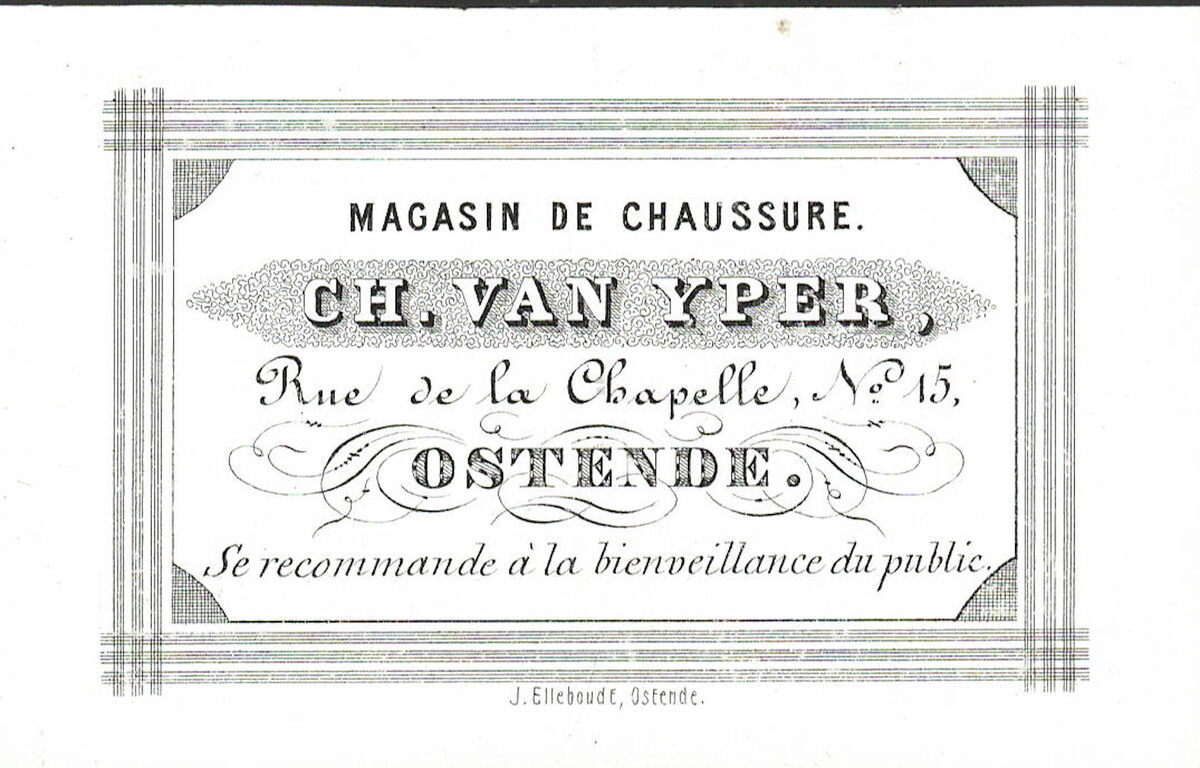Formaat : 5,6 x 9,2 cm. - Ch.Van Yper, Magasin de chaussure, Rue de la Chapelle N° 15. Ce recommande à la bienveillance du public.