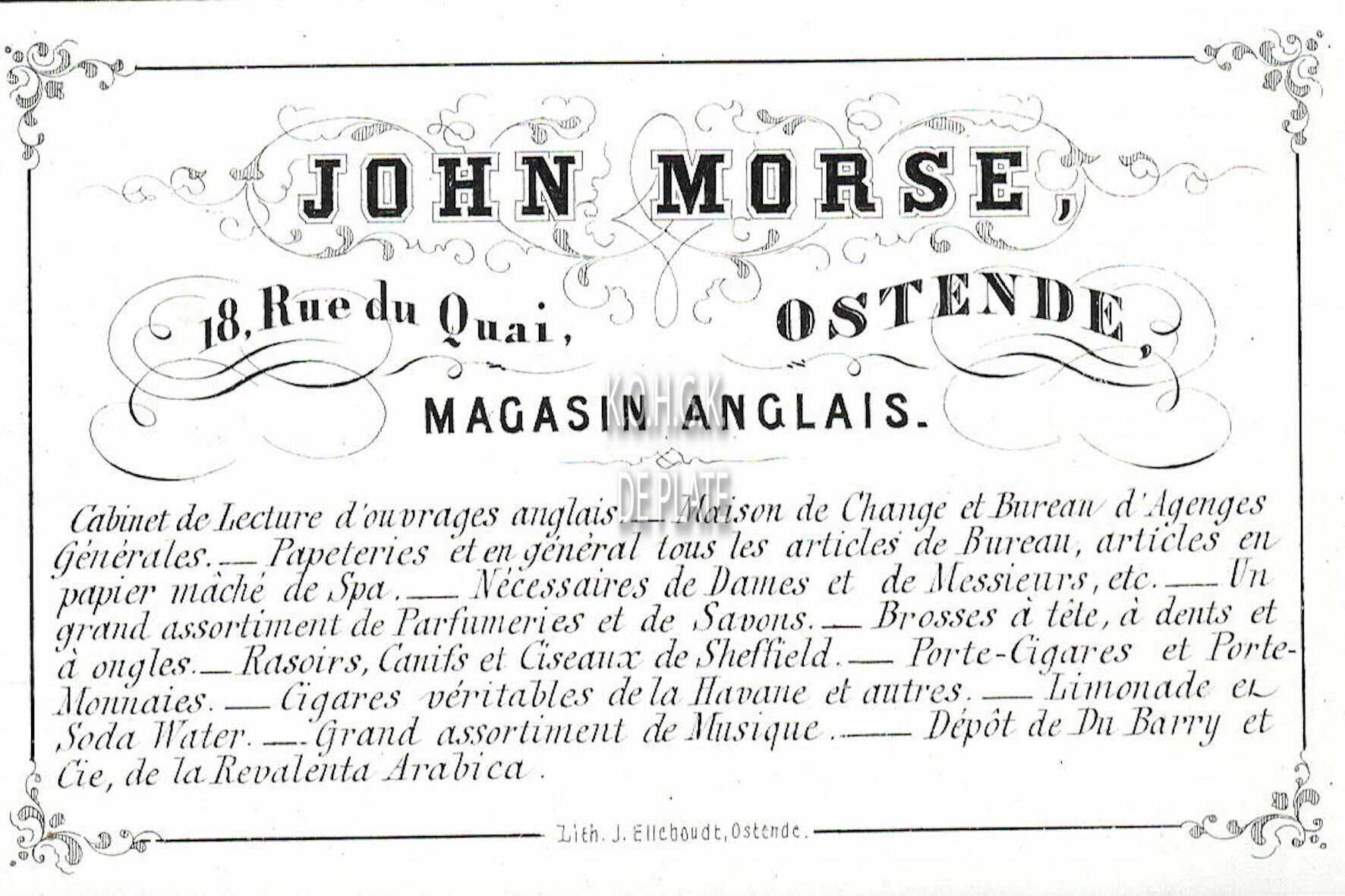Formaat : 6,2 x 9,2 cm. - .John Morse 18 Rue du Quai Ostende Magasin Anglais.Cabinet de lecture d'ouvrages anglais.- Maison de Change et Bureau d'Agenges Générales.- Papeterie et en général tous les articles de Bureau,articles en papier mâché de Spa.- Necessaires de Dames et Messieurs etc.; - Un grand assortiment de Parfumeries et de savons.-