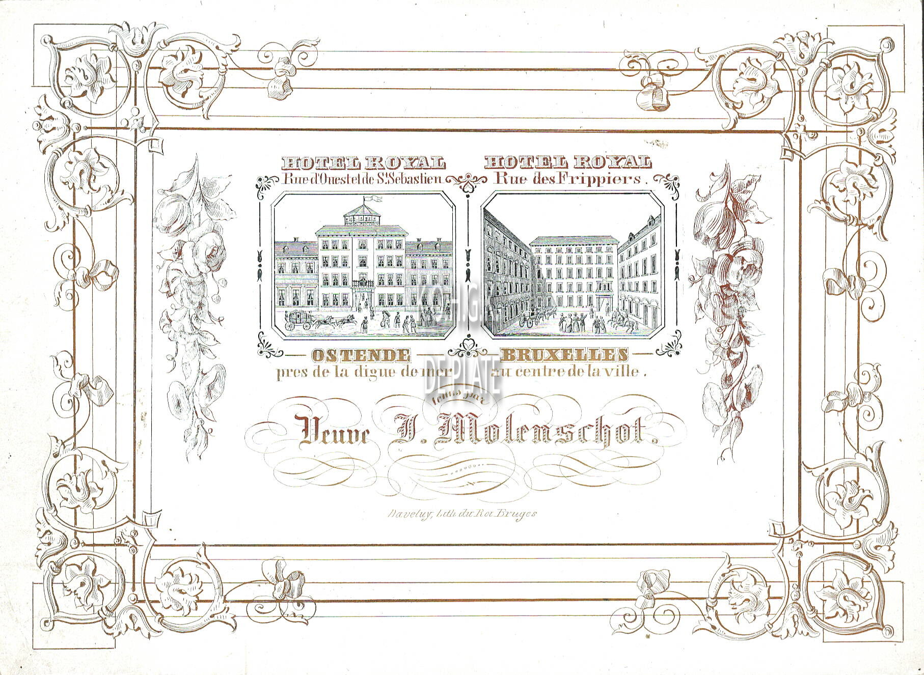 Formaat : 11,3 x 15,6 cm. - Hotel Royal Rue d' Ouest et de St Sebastien Ostende pres de la digue de mer. Hotel Royal Rue des Frippiers Bruxelles au centre de la ville tenu par Veuve J.Molenschot. Het hotel was gelegen in de Weststraat 14