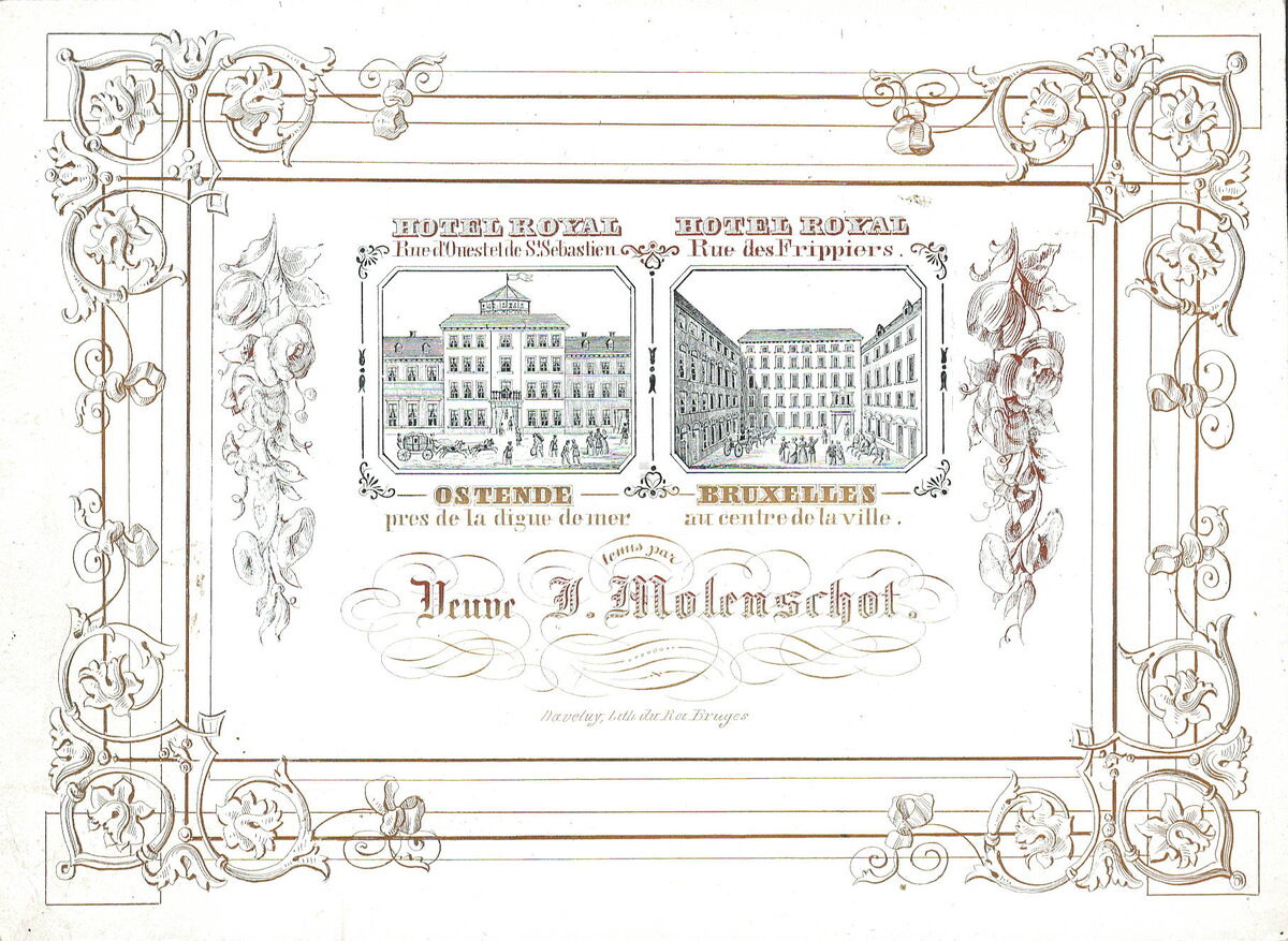 Formaat : 11,3 x 15,6 cm. - Hotel Royal Rue d' Ouest et de St Sebastien Ostende pres de la digue de mer. Hotel Royal Rue des Frippiers Bruxelles au centre de la ville tenu par Veuve J.Molenschot. Het hotel was gelegen in de Weststraat 14