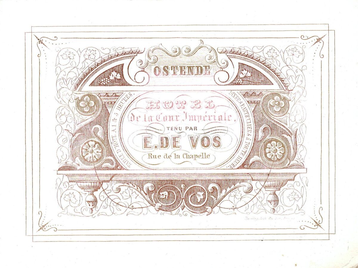 Formaat : 10,5 x 14,1 cm.- OSTENDE - Hôtel de la Cour Impériale tenu par E. De Vos - Rue de la Chapelle - Table d'hôte a 1 & 5 heures. - Diners particuliers à toute heure.