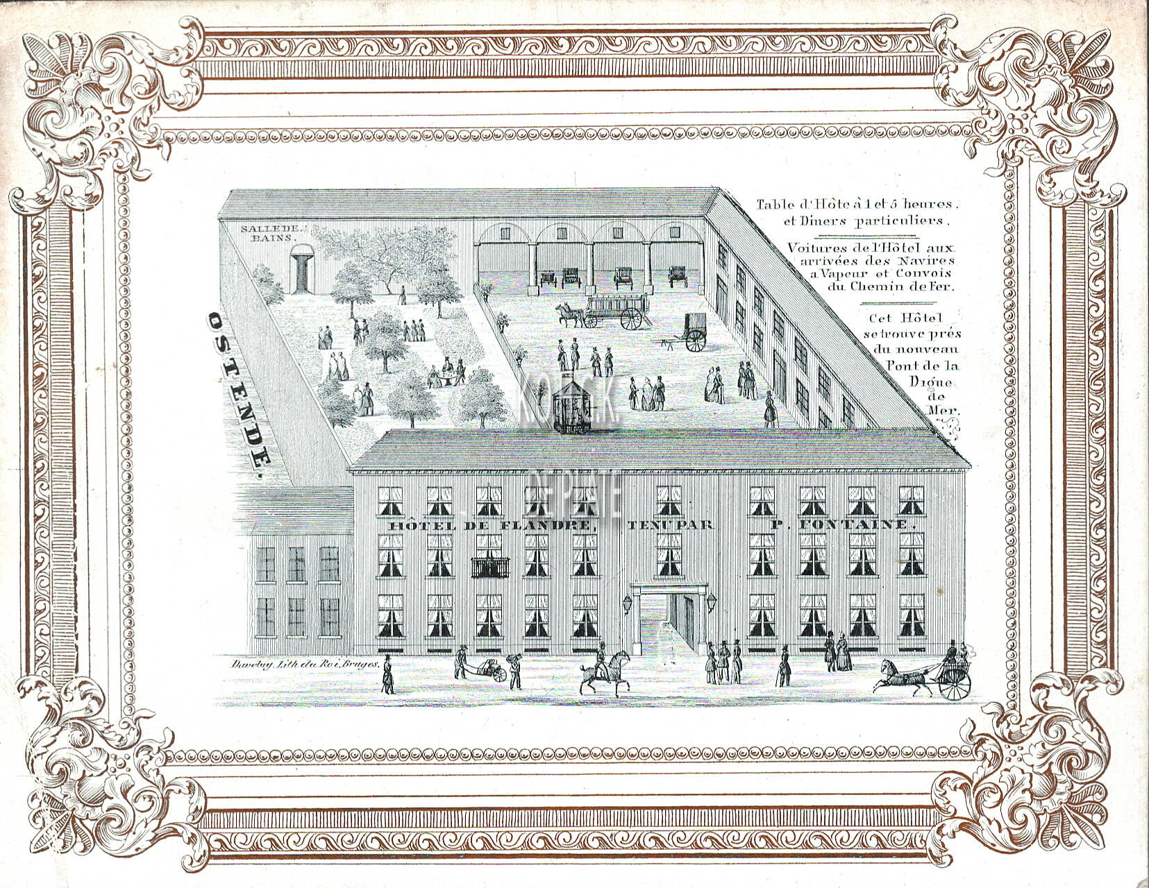 Formaat : 11 x 14,1 cm. - Hôtel de Flandre tenu par P.Fontaine Ostende. Salle de Bains. Table d'Hôte à 1 et 5 heures et Diners particuliers. Voitures de l'Hôtel aux arrivées des Navires a Vapeur et Convois du Chemin de Fer. Cet Hôtel se trouve prés du nouveau Pont de la Digue de Mer.