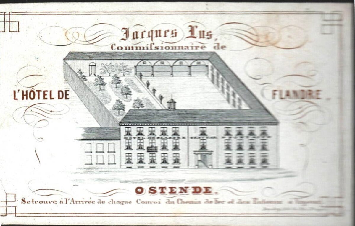 Formaat : 5,2 x 8,8 cm. - Jacques Lus Commissionaire de L'Hôtel de Flandre Ostende. Se trouve à l'Arrivée de chaque Convoi du Chemin de Fer et des Bateaux à Vapeur.