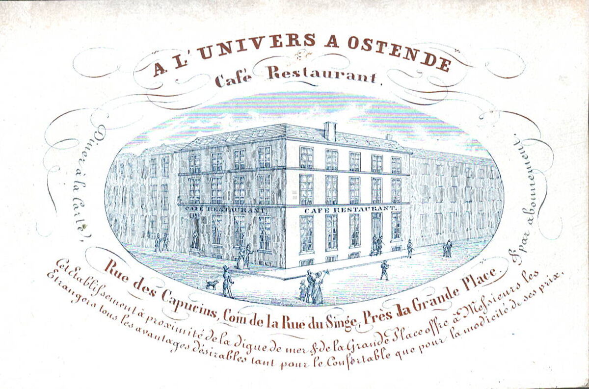 Formaat : 6,3 x 9,3 cm. - A L'Univers à Ostende Café Restaurant, Rue des Capucins, Coin de la Rue du Singe. Prés la Grande Place. Diners à la Carte & par abonnement Cet Etablissement à proximité de la digue de mer & de la Grande Place offre à Messieurs les Etrangers tous les avantages désirable tant pour le Confortable que pour le modicité de ses prix.
