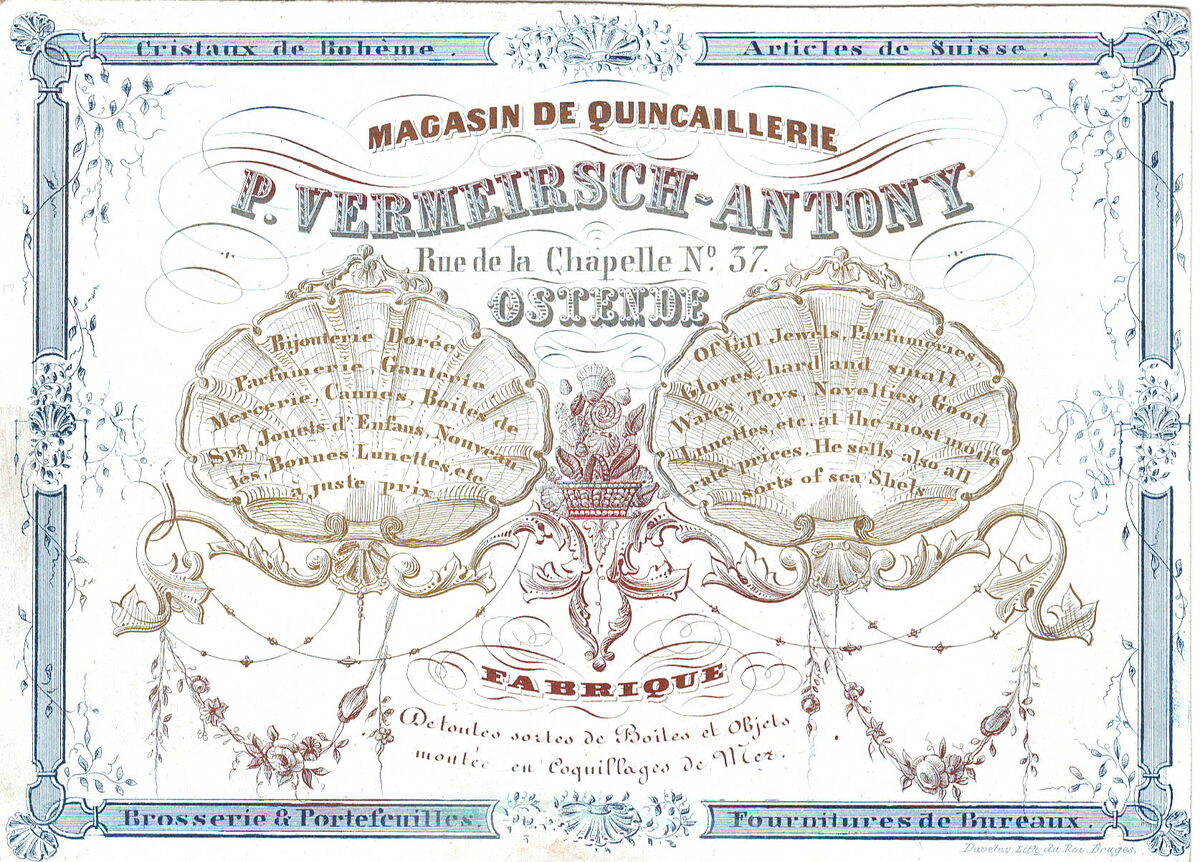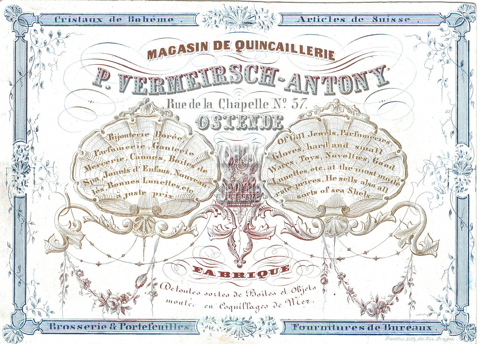 Formaat : 10,3 x 14,2 cm. - Magasin de Quincaillerie P.Vermeirsch-Antony Rue de le Chapelle N°57. Cristaux de Bohême. Articles de Suisse. Brosserie & Portefeuilles. Fournitures de Bureaux. De toutes sortes de Boites et Objects montée en Coquillages de Mer. Bijouterie Dorée. Parfumerie. Ganterie. Mercerie. Cannes. Boites de Spa. Jouets d'Enfans. Nouveautés. Bonnes Lunettes etc. à juste prix. Ofgill Juwels. Parfumeries. Gloves. Hard and small Wares. Good Lunettes etc. at the most moderate prices. He sells also all sorts of sea Shells.
