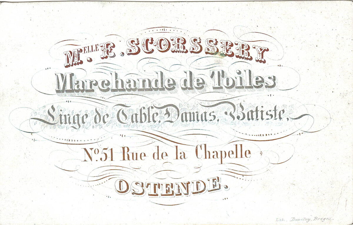 Formaat : 7,5 x 11,5 mm. - Melle.E.Scorssery Marchande de Toiles Linge de Table Damas & Batiste. N° 51 Rue de la Chapelle Ostende.