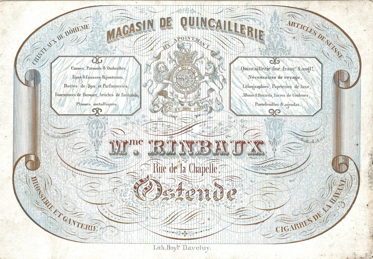 Formaat : 11,3 x 14,7 cm. - Magasin de Quincaillerie Mme Rinbaux Rue de la Chapelle Ostende. Christeaux de Bôheme. Articles de Suisse. Brosserie & Ganterie. Cigarres de la Havane. Cannes. Parasols & Ombrelles. Fine & fausses Bijouteries. Boites de Spa & Parfumeries. Fournitures de Bureaux. Articles de fantasie. Plumes métalique. Quincaillerie fine franç & angl. Nécessaires de voyage. Lithographie Papeterie de luxe. Albums & Buvards. Encres en Couleurs. Portefeuilles & agendas.