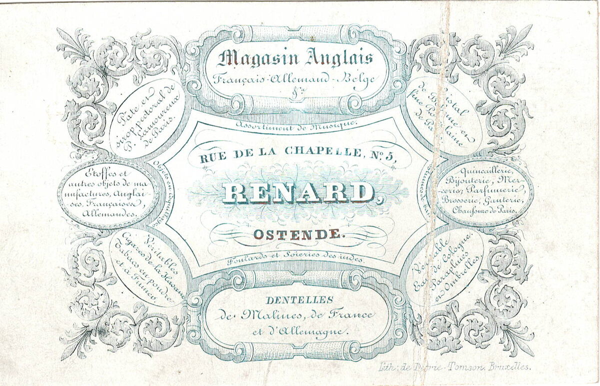 Formaat : 7,3 x 11,5 cm. - Magasin Anglais Français Allemand Belge Renard Assortiment de musique, Foulards et Soieries des Indes. Dentelles de Malines de France et d'Allemagne. Pâté et cirop pectoral de P. Lamoureux de Paris. Etoffes et autres objects de manifactures Anglaises Françaises et Allemendes. Véritables Cigares de la Havan Tabacs en poudre et a fumer. Cristal de Bôheme et fine porcelaine de Paris. Quincaillerie Bijouterie Mercerie. Parfumerie. Brosserie Ganterie. Chausures de Paris. Véritable Eau de Cologne Parapluies et Ombrelles.