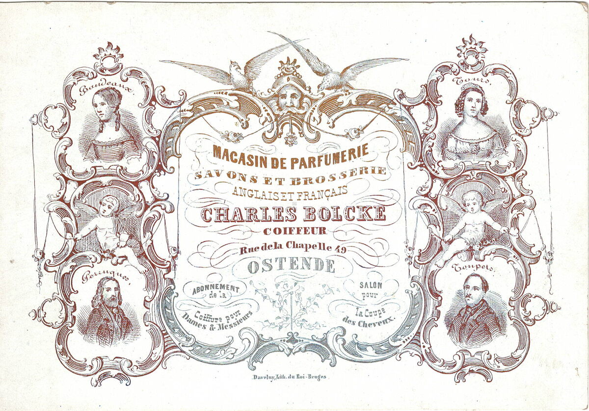 Afmeting : 10,2 x 15 cm. - Magasin de Parfumerie Savons et Brosserie Anglais et Français Charles Bolcke. Coiffeur Rue de la Chapelle N° 49 Ostende. Bandeaux perruques Tours Toupets. Abonnement de la coiffure pour Dames & Messieurs. Salon pour la coupe des cheveux.