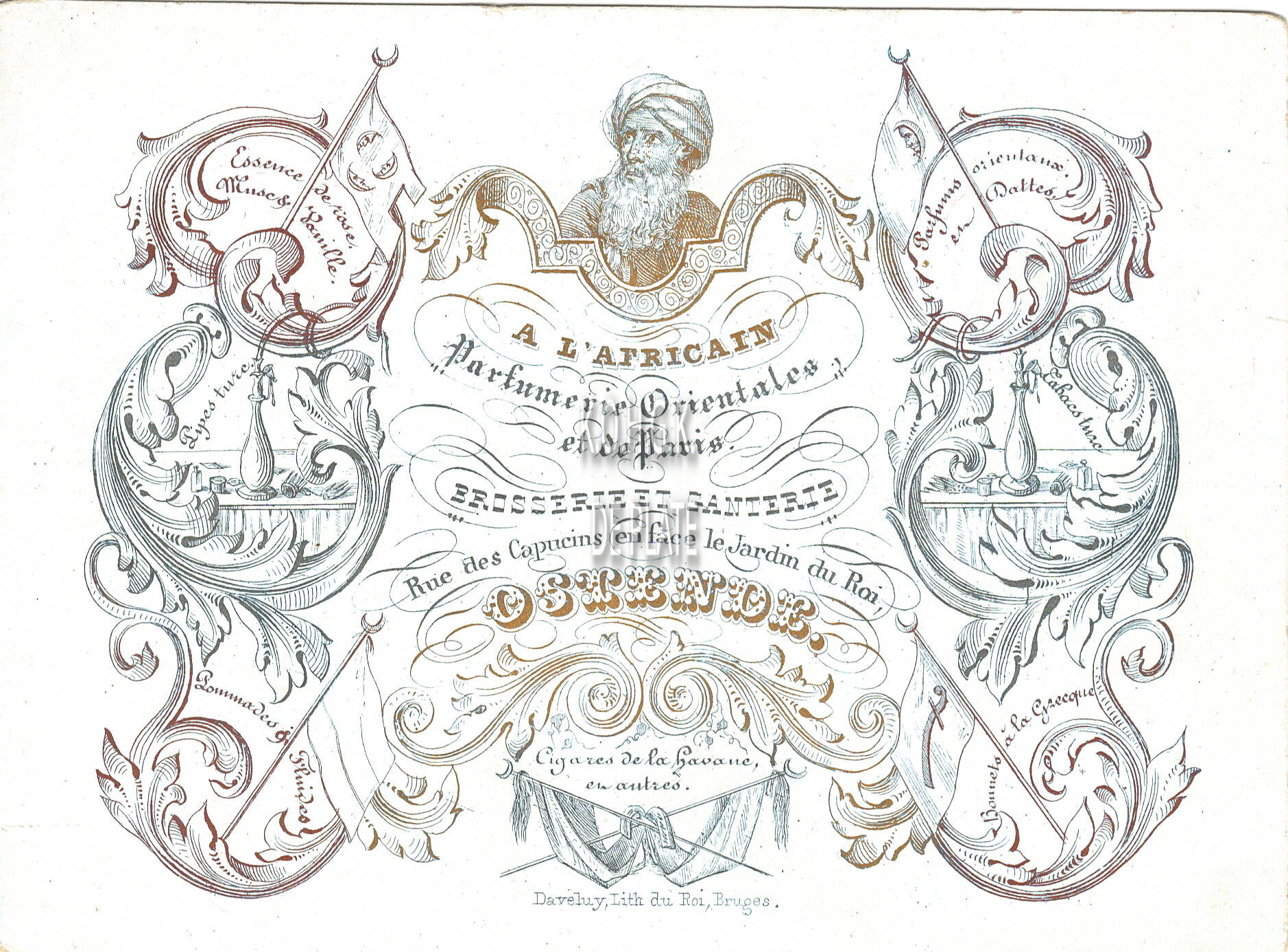 Afmeting : 12 x 16 cm. - A L'Africain, Parfumerie Orientales et de Paris. Brosserie et Ganterie, Rue des Capucins en face le jardin du Roi Ostende. Cigares de la Havane et autres. Essence de roses, Musce & Vanille. Pipes Turc. Pommades & Fluides. Parfums orienteaux et Dattes, Tabacs turc. Bonnets à la Grecque.