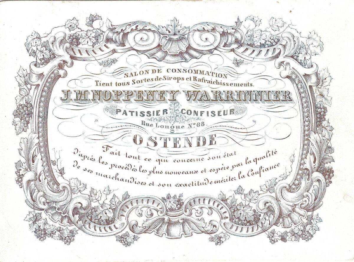 Formaat : 10,2 x 13,7 mm. - Salon de consommation. Tient toutes Sortes de Sirops et Refraichissements. J.M.Noppeney Warrinnier, Patisier Confiseur, Rue Longue N°68 Ostende. Fait tout ce qui concerne son étât d'après les procédés les plus nouveaux et espère par les qualité de ses marchandises et son exactitude mériter la Confiance.