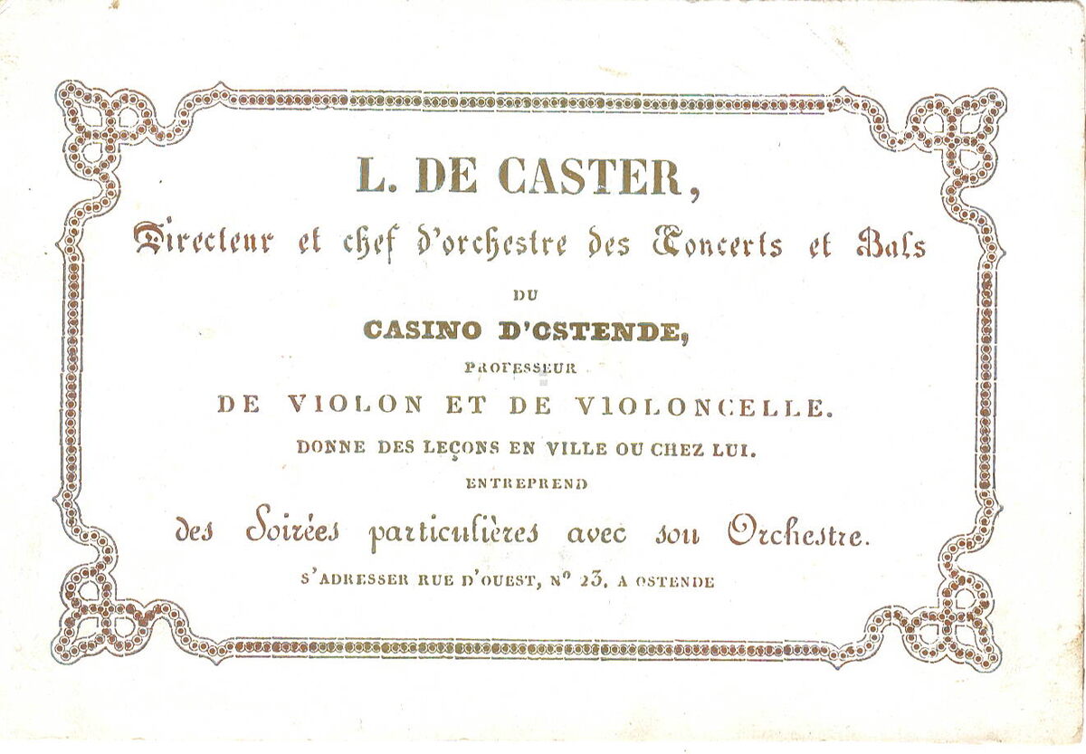Formaat : 7,8 x 11,2 cm. - L. DE CASTER, Directeur et chef d'orchestre des Concerts et Bals du Casino d'Ostende. - Professeur de Violon et de Violoncelle, donne des leçons en Ville et chez lui entreprend des Soirées particulières avec son Orchestre . S'Adresser Rue d'Ouest N° 23 à Ostende.